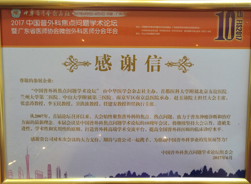 本次會(huì)議,我司參會(huì)人員積極配合主委會(huì)開(kāi)展各項(xiàng)會(huì)務(wù)工作。因此,大會(huì)主辦方為我公司頒發(fā)了感謝信,這是對(duì)我們努力付出極大地認(rèn)可與肯定,我們將繼續(xù)努力,讓更多的人認(rèn)識(shí)了解我們的品牌,一起開(kāi)創(chuàng)我國(guó)醫(yī)療事業(yè)更加美好的未來(lái)!
